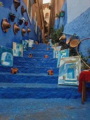 in die blaue Stadt. Der Name bedeutet „zwei Hörner“ und ist nach den zwei Bergspitzen des Rif-Gebirges benannt, die von der Stadt aus zu sehen sind. Das Städtchen erinnerte mich an Altea, nur eben blau angestrichen. Sogar die Straßennamen sind auf arabisch und spanisch geschrieben. Es hat total viel Spaß gemacht durch die Gasen zu streifen und sich all die Herrlichkeiten anzuschauen, die angeboten wurden. Von hier kann man auch fantastische Wanderungen durch das Rif-Gebirge tätigen. Sonja und ich sind am letzten Morgen mal kurz auf eine Anhöhe gestiegen, um einen besseren Überblick zu erhalten. In Chefchaouen nächtigten wir ebenfalls in einem Riad. Dieses zeichnetet sich nicht nur durch seinen modernen, arabischen Einrichtungsstil aus, sondern auch für seine überdachte Dachterrasse. Endlich konnten wir morgens gemeinsam yogieren. Alle Riads verfügen über Dachterrassen. Jedoch hatte es tagelang vorher geregnet und der Regen und die Kälte hatte uns davon abgehalten morgens aufs Dach zu steigen.